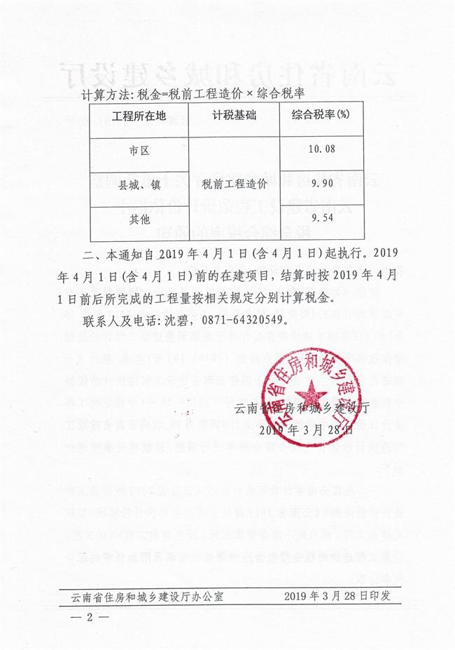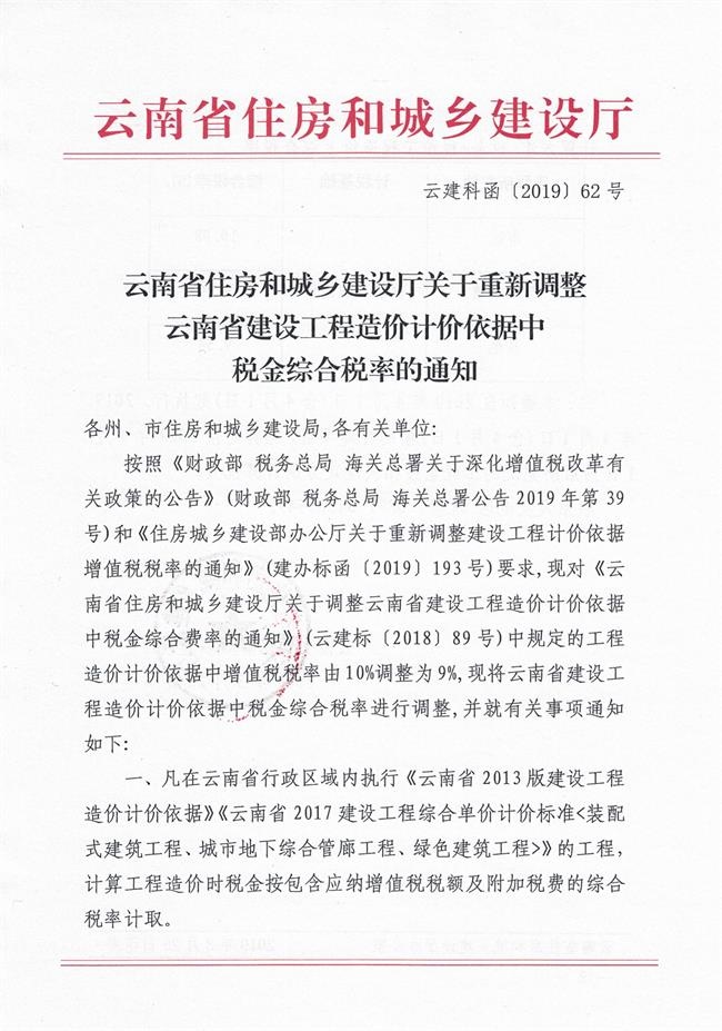 增值税税率的通知》(建办标函(2019)193号)要求,现对《云南省住房和城乡建设厅关于调整云南省建设工程造价计价依据中税金综合费率的通知》(云建标(2018)89号)中规定的工程造价计价依据中增值税税率由10%调整为9%,现将云南省建设工程造价计价依据中税金综合税率进行调整,并就有关事项通知如下: